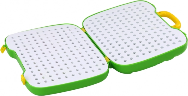Az összecsukható alap lábakkal szilárd felületet biztosít csavarozáshoz és építéshez. Játék után mindent visszazárhat a bőröndbe, és magával viheti.