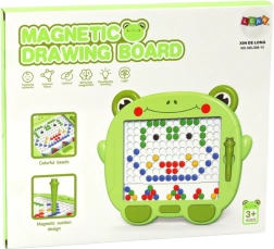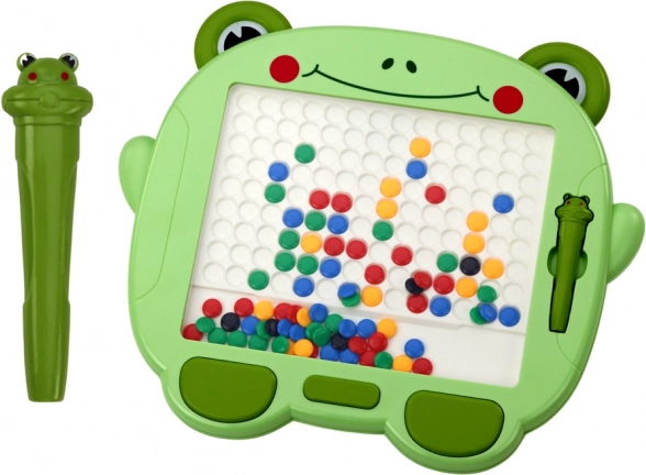 A tábla közepén egy nagy, füles fehér felület található, amely tökéletes a mágneses gyöngyök elrendezéséhez. A különböző színekben elérhető gyöngyökből – fekete, kék, sárga, piros és zöld – változatos minták és képek készíthetők. Az átlátszó védőfalnak köszönhetően, amely megóvja a rajzot a véletlen sérülésektől, a gyerekek szabadon rendezhetik kompozícióikat a béka mintás speciális mágneses toll segítségével.