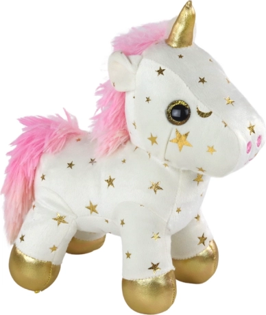 A fehér unikornis arany csillagokkal, rózsaszín sörénnyel és arany patákkal selymes tapintású, ölelgetésre csábít.