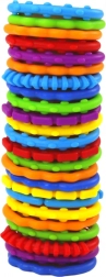 A gyerekeknek szánt karkötőjáték-készlet célja a gyermek érzékelésének és kézügyességének fejlesztése. A készlet 24 darab, különböző színű karkötőt tartalmaz, amelyek nemcsak a felfedezést ösztönzik, hanem gazdag vizuális élményekkel serkentik a kisgyermek látását is.