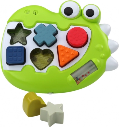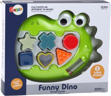 Fedezze fel a szórakoztató, dinoszaurusz alakú érzékszervi formabedobót, amely fejleszti gyermeke finommotorikáját, a formák és színek felismerését, valamint az érzékelést. Fényhatások, vidám dallamok és 6 különböző geometriai forma olyan elemekkel, mint csörgő, tükör vagy tapintást serkentő kiemelkedések, amelyek hosszan tartó, biztonságos és ingergazdag játékot biztosítanak.