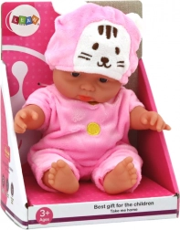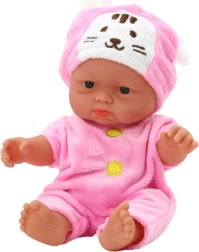 Ez a kis baba kedves megjelenésével és kidolgozásával örömöt szerez. Kis méreteinek köszönhetően könnyen elfér a gyerekek kezében, utazáshoz és mindennapi játékhoz is ideális. A rózsaszín ruhácska sárga gombokkal és a nyuszifüles sapka egyedi bájt kölcsönöz a babának.