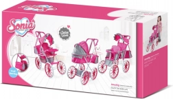 Stílusos rózsaszín babakocsi szilárd fém vázzal, ideális mindennapi játékhoz otthon és a szabadban. A nagy habkerekek sima haladást biztosítanak különböző felületeken, az összecsukható napellenző védi a babát, a praktikus táska és az alsó kosár pedig bőséges helyet kínál a kiegészítőknek. Megfelel a CE és EN71 szabványoknak, 3 éves kortól ajánlott.