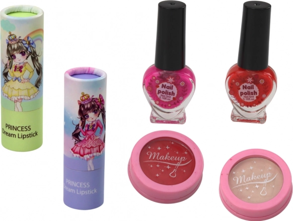 Szemhéjfesték, púder, pirosító, rúzsok, körömlakkok, körömreszelő és további tartozékok – minden egy praktikus szettben.