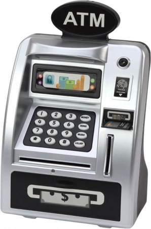 A gyermek pénzkiadó automata több mint játék. Ujjlenyomat-olvasót és gyermekek számára készült hitelkártyát használ az autentikus élményért. A kártya beadása, a kód megadása és az ujjlenyomat használata vidám dallamot és fanfárokat indít a fiók megnyitásakor.
