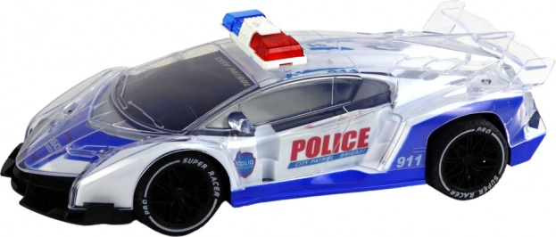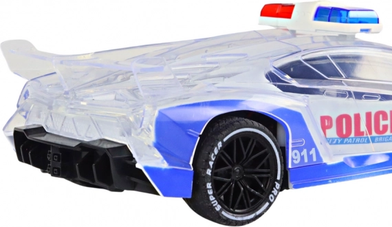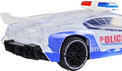 Szórakoztató rendőrségi sportautó távirányítással, 1:16 méretarányban, áttetsző karosszériával és színes fényekkel. Az intuitív vezérlőnek köszönhetően pontos manővereket és teljes mozgástartományt tesz lehetővé. Megfelel a CE és EN71 előírásoknak, 3 éves kortól ajánlott; tápellátás 4× AA az autóhoz és 2× AA a távirányítóhoz (nem tartozék).