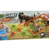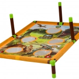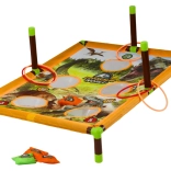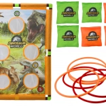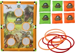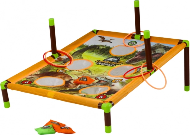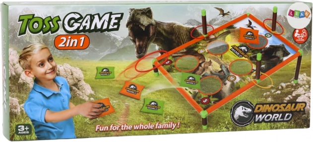 A játék tartós, színes játéktáblából áll, amelyet különféle dinoszauruszok képei díszítenek. Ez nemcsak ösztönzi a játékot, hanem serkenti a gyermeki képzeletet is. A tábla pontozási rendszert tartalmaz, amely versengést és izgalmat visz a játékba. A készlethez speciálisan tervezett dobózsákok is tartoznak a stabil repülésért és a pontos dobásért, valamint karikák.