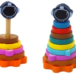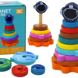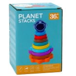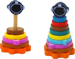 A világűr témájú fa rakosgató piramis ötvözi a játékot és a tanulást. A gyerekek méret szerint válogatják a színes karikákat – a „bolygókat” –, így gyakorolják az összehasonlítást, a tájékozódást és a türelmet. A végső elem, az űrsisak, plusz örömöt ad a feladat befejezéséhez.