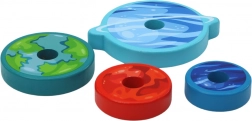A különböző méretű, színes fa „bolygók” tanítják a válogatást, az összehasonlítást és a színek felismerését.