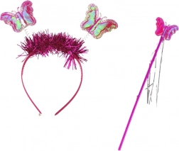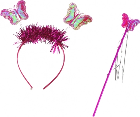 A szett része egy rózsaszín hajpánt bájos pillangófülekkel, amely különleges bájt és eleganciát kölcsönöz a gyerekek megjelenésének. A fényes anyagból készült varázspálcával a gyermek igazi tündérnek érezheti magát, aki varázsigéket mond és kívánságokat teljesít.