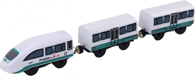 A Train-X szerelvény könnyen csatlakoztatható kocsikkal gondoskodik a gördülékeny haladásról a fa síneken. Meghajtás: 1× AA (nem tartozék).