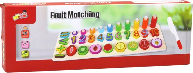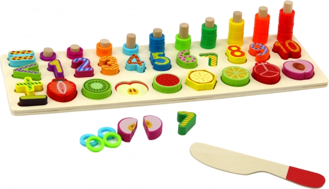 Termékjellemzők:- A számoknak és színes gyümölcsöknek kialakított mélyedések tökéletesek a számolás, az alak- és színfelismerés, valamint a vizuomotoros koordináció fejlesztésére.