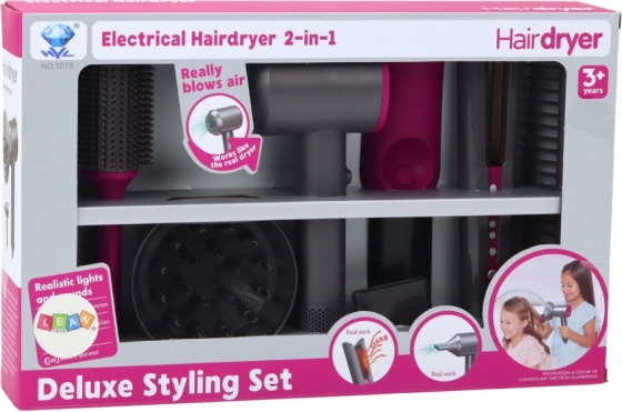 A szett legnagyobb előnye az autentikusság. A szárító valódi légfúvást imitál, ami növeli a játék realizmusát. Ennek köszönhetően a gyerek professzionális fodrászként tevékenykedhet, babák vagy más játékok haját száríthatja és formázhatja. A hajvasaló világító melegítési effektussal van felszerelve és sistergő hangot ad ki, ami még valósághűbbé és izgalmasabbá teszi a játékot.