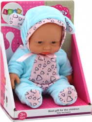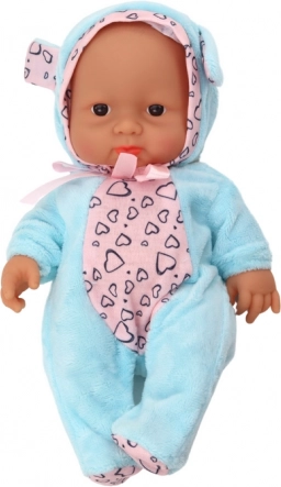 A bájos kis baba – csecsemő szívecskés kék ruhácskában és fülecskés sapkában minden kislánynak örömet szerez. Mozgatható karokkal és lábakkal, forgatható fejjel rendelkezik, és a 21 × 14 × 6,5 cm-es kompakt méretnek köszönhetően utazáshoz és a gyerekágyba is ideális. A játék CE tanúsítvánnyal rendelkezik és megfelel az EN71 szabványnak, 3 éves kortól ajánlott.