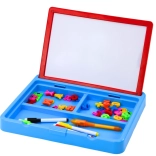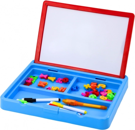 A tábla alatt praktikus tároló 3 rekesszel található minden kiegészítőnek – a markerek, a mágneses betűk és számok a csomag részét képezik. A kétoldalas kialakítás többféle alkotást és tanulást tesz lehetővé, a könnyű törlésnek köszönhetően pedig újra és újra alkothatnak.