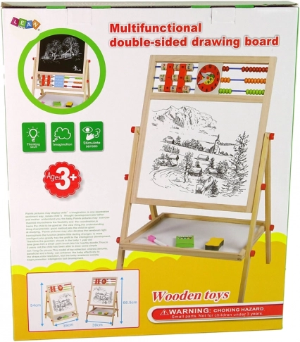 .A kétoldalas, oktató jellegű rajztábla abakusszal, órával és ábécével kiváló fejlesztő eszköz a legkisebbek számára. Masszív fából készült, ami tartósságot és biztonságot nyújt játék közben. Forgatható kialakítása két különböző felület használatát teszi lehetővé: az egyik fekete, krétás rajzoláshoz ideális, a másik fehér, filctollal való rajzoláshoz tökéletes.