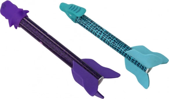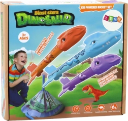 A készlet három dinoszaurusz alakú rakétát tartalmaz különböző színekben (narancs, kék, lila), ami biztosítja a változatos játékot.
