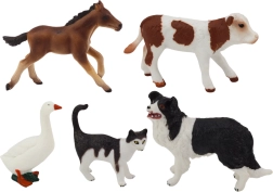 5 darabos vidéki állatfigura készlet: Ló, Tehén, Macska, Lúd, Kutya
