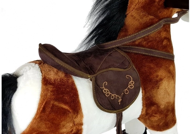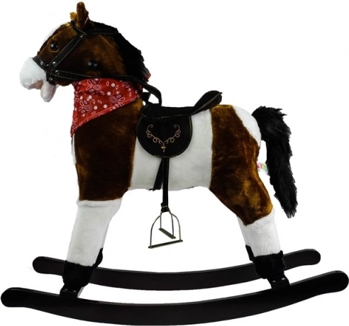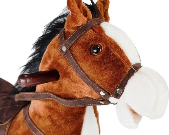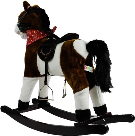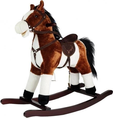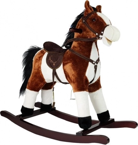 Sötétbarna hintalovunk puha plüss anyagból készült, amely hosszú játék közben is kényelmet nyújt. A ló élethű hangokkal van felszerelve, amelyek a fül megnyomására aktiválódnak: nyerítés és vágtahangok, hogy életre keltsék a Vadnyugat hangulatát.