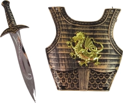 A gyermek szamuráj jelmez teljes készlete tartalmaz arany páncélt sárkánymintával, amely könnyen igazítható a rugalmas gumipántoknak köszönhetően. A jelmez kényelmes karddal rendelkezik, melynek markolatán különböző minták találhatók, valamint íjjal pontos távoli lövéshez.