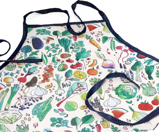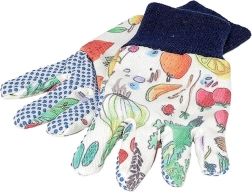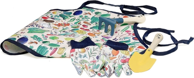 A kötény és kesztyű színes mintái vidámmá teszik a kertészkedést.