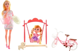 Nagy baba 30 cm (ízületes), kis baba 16 cm, autó 33 cm, robogó 30 cm, kerékpár 17 cm, hinta, kiskutya, kalap, sisak, bevásárlótáska