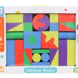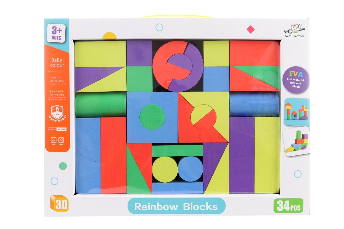 Keményebb habból készült kockák különböző formákban és színekben. Dobozban csomagolva. A csomag mérete kb. 37,5×26,5×4,5 cm. Ajánlott életkor: 3+.