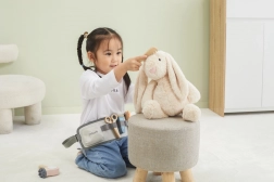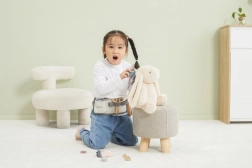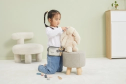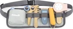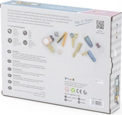 Ez a fodrász készlet úgy van tervezve, hogy a gyerekek fejleszthessék kreativitásukat szerepjáték során. Tartalmaz különféle fa eszközöket, mint például hajszárítót, fésűt, hajvasalót, ollót, borotvát és borotvapengét. Állítható övvel a gyerekek mindig kéznél tarthatják a szükséges eszközöket. Minden játék biztonságos és nem mérgező festékekkel van festve fából.