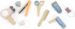 Különböző fa eszközök, mint például olló, fésű és hajszárító segítségével ez a készlet mindent biztosít az alkotó fodrász szerepjátékhoz.