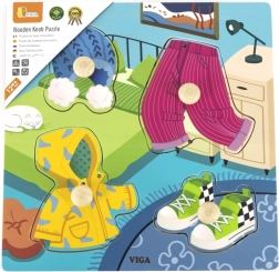 Fa puzzle ruhadarabokkal a neves Viga márkától, amely nemcsak hagyományos kirakós játékot kínál, hanem lehetővé teszi a gyerekek számára a finommotorika és az alakfelismerő képességek fejlesztését is. A puzzle emellett segít javítani a logikus gondolkodást, koncentrációt és a memóriát a gyerekeknél.