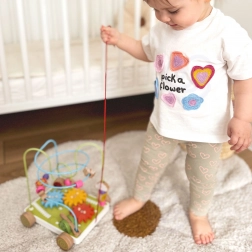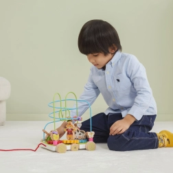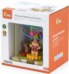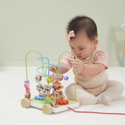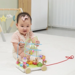 Egy játék, rengeteg lehetőség – a gyerekek a zsinórnál fogva húzhatják, a fém huzalokon tologathatják a gyöngyöket, és forgathatják a fogaskerekeket. A mozgást és az érzékszervi játékot ötvözi.