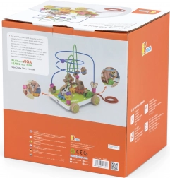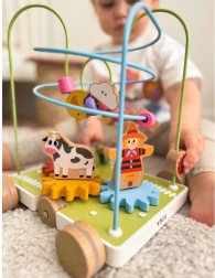 Ez a kreatív, kerekeken guruló fa játék végtelen felfedezési lehetőséget nyújt a gyerekeknek. A masszív alaplapon megtalálható a gazda, a tehénke és a kutyus figurája, a színes motorikus hurok gyöngyökkel, napocskával és pillangóval, valamint forgatható fogaskerekek. Az állatkák könnyen cserélhetők és mozgathatók, így a gyerekek saját történeteket alkothatnak, miközben fejlesztik finommotorikájukat.