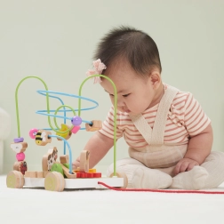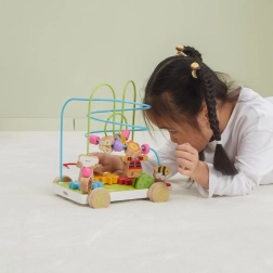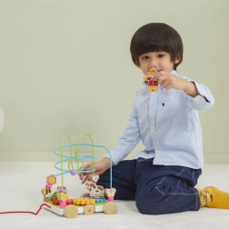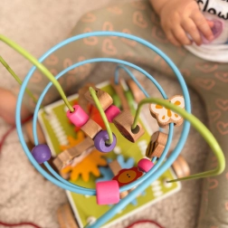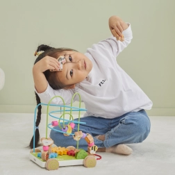 A színes gyöngyök és formák a drótokon támogatják a pontos fogásokat, a figyelmet és a kéz–szem koordinációt. A gyerekek természetes módon gyakorolják a színeket, formákat és a logikus gondolkodást.