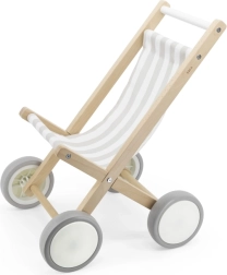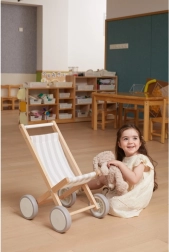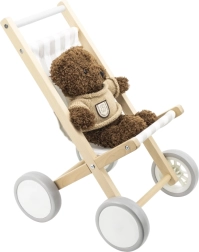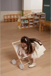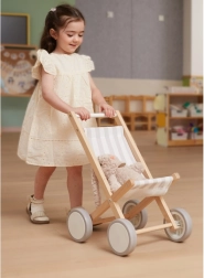 A fából készült babakocsi időtálló játék, amely támogatja a szerepjátékot, a gondoskodást és a mindennapi mozgást. A természetes fa szerkezet stabilitást és tartósságot biztosít, míg a textil ülés kényelmesen szállítja a babákat és a kedvenc plüssöket.
