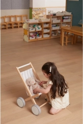 A természetes fa keret stabilitást és hosszú élettartamot biztosít. Ideális mindennapi játékhoz babákkal és plüssökkel.