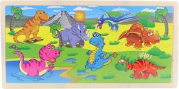 Szórakoztató, fából készült dinoszaurusz témájú puzzle 96 darabbal, masszív fa lapra rögzített kerettel, amely praktikus alapot biztosít a kirakáshoz. Remek választás gyerekeknek – fejleszti a fantáziát, a finommotorikát és a koncentrációt.