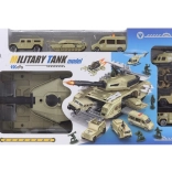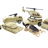 Katonai készlet nagy tankkal, 6 kisautóval és 1 helikopterrel. Anyaga műanyag. Dobozban csomagolva. A csomag mérete kb. 46×23,5×11 cm. Ajánlott életkor: 3+