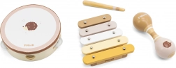 A készlet tartalmaz tamburint, xilofont verővel és maracast – mindet kompakt méretben a gyerekkezekhez.
