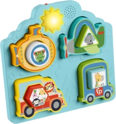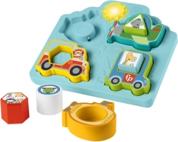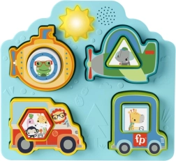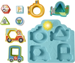 A helyes elem behelyezése valósághű közlekedési eszköz- és állathangokkal jutalmazza a gyermeket. A napocska gomb további effekteket ad, és ösztönzi a kíváncsiságot.