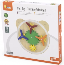 Öt színes fogaskerék és három szélforgó kapcsolódik egymáshoz. A gyermek megérti az ok-okozat elvét, amikor egyetlen mozdulattal az egész mechanizmust megforgatja.