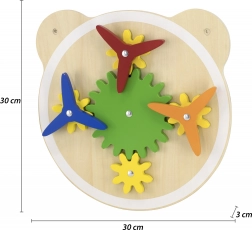 A medvefej alakú fa panel öt összekapcsolt fogaskereket és három szélforgót kombinál. Játék közben a gyerekek elsajátítják az ok-okozat elvét: ha egy kereket elfordítanak, mindegyik mozgásba lendül. Természetes módon fejlesztik a finommotorikát, a vizuális észlelést és a csapatmunkát, amikor egy panelnél felváltva játszanak.