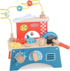 Speciálisan tervezett elemek, mint a kalapács és a golyólabirintus, segítik a finommotoros koordináció és ügyesség fejlesztését.