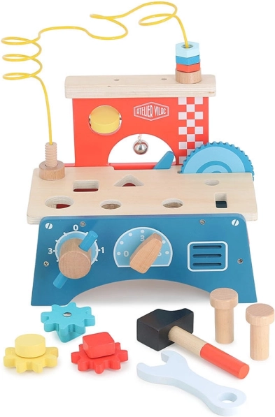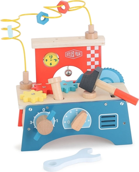 A Vilac többfunkciós asztala úgy készült, hogy a gyermekek fejlődését több területen is támogassa. Tartalmaz kalapácsot, csengőt, fogaskerekeket és sok más elemet az érzékelés és a motoros képességek fejlesztésére. A Montessori-módszer által inspirált játékok támogatják a természetes fejlődést, hangsúlyozzák az önállóságot és a felfedezést. A gyerekek megtanulnak együtt játszani, ami segíti szociális készségeik fejlődését.