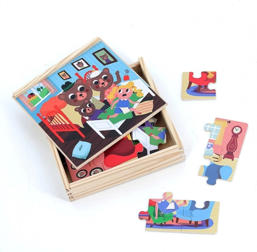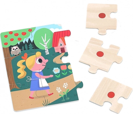 Négy különálló, 9 darabos puzzle lépésről lépésre meséli el Aranyhaj történetét, támogatva a gyermeki fantáziát és a mesemondást.