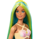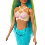 Fedezze fel a tenger alatti világ szépségét ezzel az egyedi Barbie sellő babával! Ez a konkrét baba kagyló-inspirálta fűzővel és ombre hatású uszonnyal díszített türkiz farokkal rendelkezik.