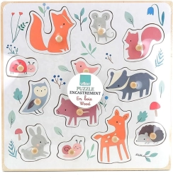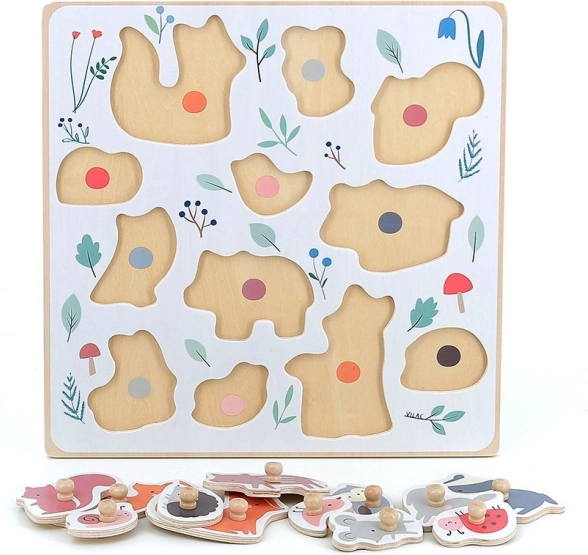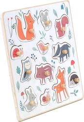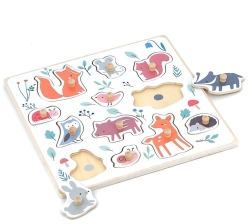Ez a minőségi, erdei motívumokkal díszített fa kirakó Sarah Betz illusztrátor közreműködésével készült, és felfedezésre ösztönzi a gyerekeket. Az alaplapon lévő színes pöttyök finoman súgnak, hová melyik elem illik, így támogatják a koncentrációt és a logikus gondolkodást. A masszív fa fogantyúk révén a gyerekek gyakorolják a helyes fogást és fejlesztik finommotorikájukat.