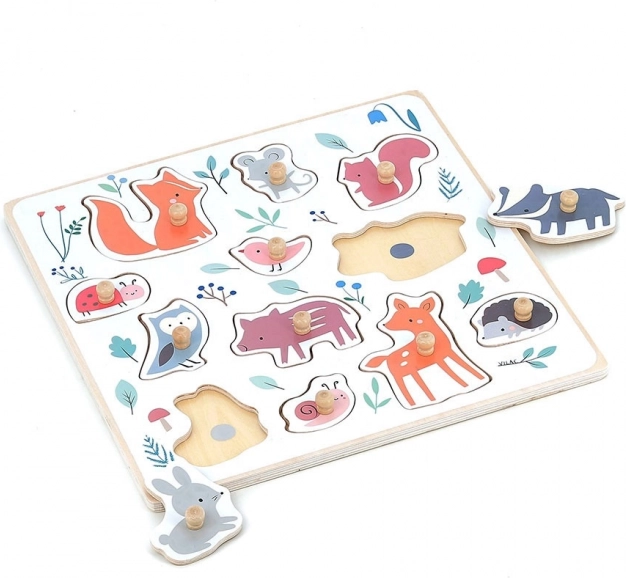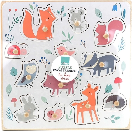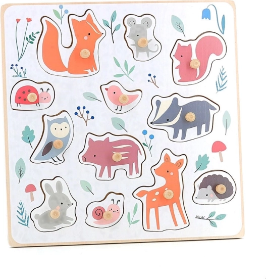 Róka, egér, mókus, katicabogár, kismadár, borz, bagoly, malac, nyúl, csiga, őz és sündisznó – ideális a szókincs bővítésére, valamint az alakok és színek megismerésére.