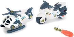 Fedezze fel a közlekedési eszközök világát ezzel a kreatív és interaktív csavarozható készlettel. A csomag három modellt tartalmaz: helikoptert, motorkerékpárt és egy csavarhúzót, amelyekkel a gyerekek játszhatnak és tanulhatnak egyidejűleg.