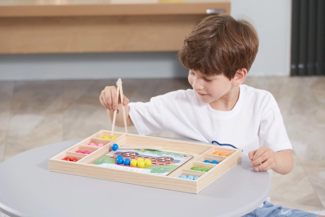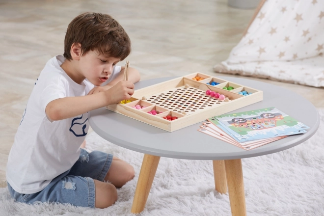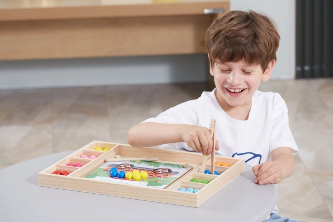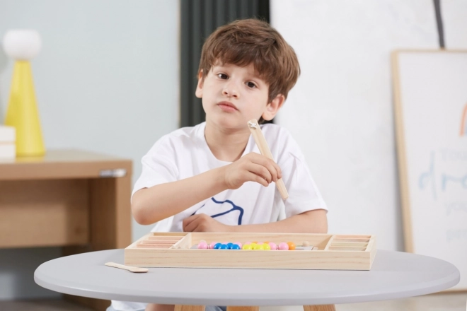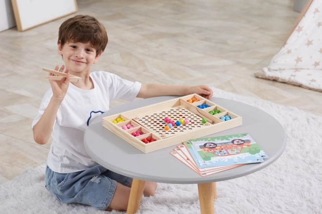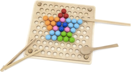 A "Kapd el és Rendezd" oktató fa játék lehetővé teszi a gyermekek számára, hogy különféle mintákat és színeket próbáljanak ki a mellékelt papírok vagy saját fantáziájuk alapján. Ezzel a játékkal a gyerekek rögzíthetnek papírt a fa tálcán, és pálcikák, kanál vagy kapocs segítségével színes golyókat helyezhetnek a deszkán lévő lyukakba. Végül gyönyörű képeket készíthetnek.