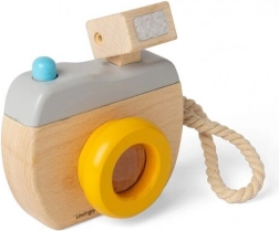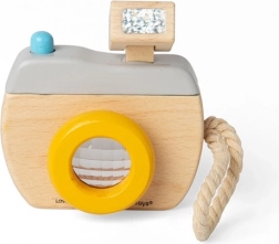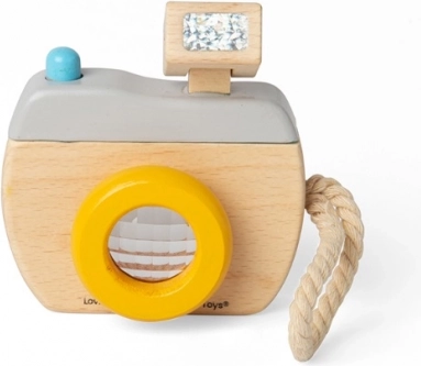 A hangsúlyos objektív, a felső „vaku” és a működő gomb autentikus fotózási élményt nyújt a gyerekeknek. A minőségi fa és a lekerekített élek biztonságos játékot garantálnak éles részek nélkül.